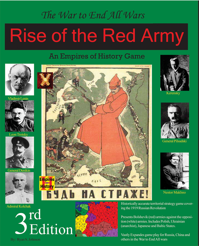 Description The Rise of the Red Army is a strategy board game covering the Russian Revolution following the end of the World War I. It is an easy to learn Axis & Allies variant style game, yet represents the conflict in Russia with historical accuracy. For 2-6 players, the Rise of the Red Army primarily represents the Bolshevik (Reds) conflict with the Crimean and Siberian (White) Russian opposition forces. In the middle of this conflict you have a number of "wild cards". Such as the Ukrainian Anarachist movement which fought against both the "Reds" and the "Whites". Such as the nations of Finland, Poland, and the Baltic states first fighting for self liberation, then territorial acquisitions against the various Russian factions. Toss in a Japanese occupation of the far east and western support of the Crimean, Siberian, and Northern White Factions, and you have multi dimensional conflict unlike any other in history.